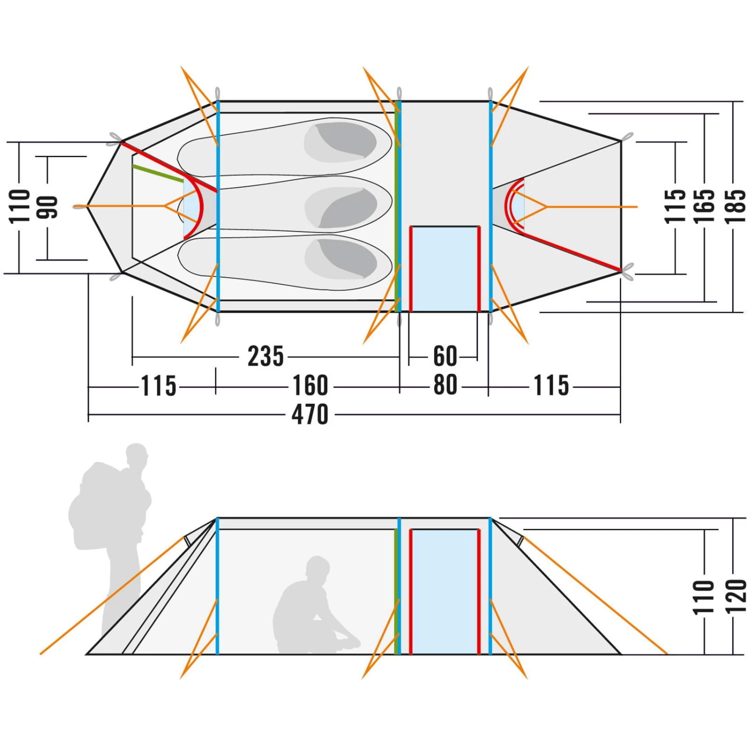 Merkmale: Tunnelzelt mit drei Gestängebögen und Apside; Himmeltasche; Herausnehmbare Tasche in der Apside; Seitlicher Eingang in die Apside mit separat verschließbarem Moskitonetz; Drei Eingänge in das Außenzelt; Zwei Lüfter im Außenzelt; Wasserdicht versiegelte Nähte; Wasserdichte Verarbeitung der Abdeckungen, Lüfter und Ansatzpunkte; Reflektoren an den Zeltleinen; Praktische Packhilfe für Zeltleinen; Verstärkte Eckpunkte mit Gurtbandschlaufen; Extra langes Innenzelt (235 cm) für mehr Liegekomfort; Zwei Eingänge in das Innenzelt, einer davon mit separat verschließbarem Moskitofenster; Zwei Einstecktaschen im Innenzelt neben dem Eingang; Bequeme Einstecktasche in Greifhöhe am Fußende; Wäscheleine im Innenzelt; Lüfter im Innenzelt; Eloxiertes Aluminium-Zeltgestänge; Inklusive Packsäcke für Zelt und Gestänge