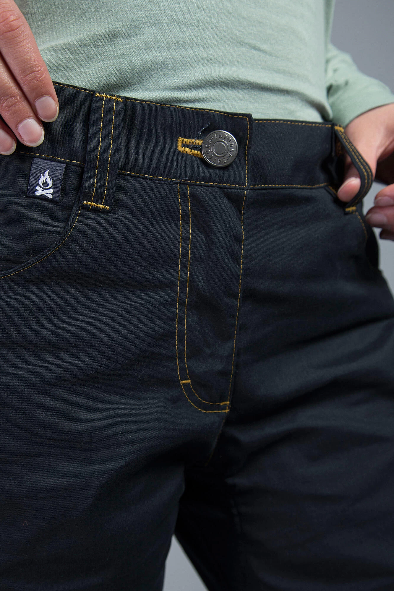 - Bund mit Gürtelschlaufen und Jeansknopfverschluss