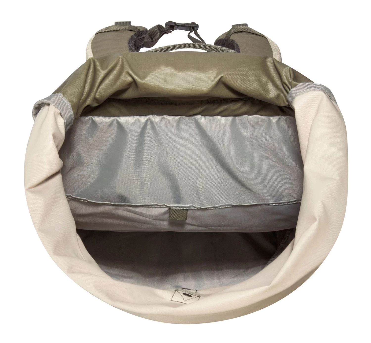 - Rucksack wird mit Rollverschluss, Druckknopf und stufenlos verstellbarem Clipverschluss geschlossen