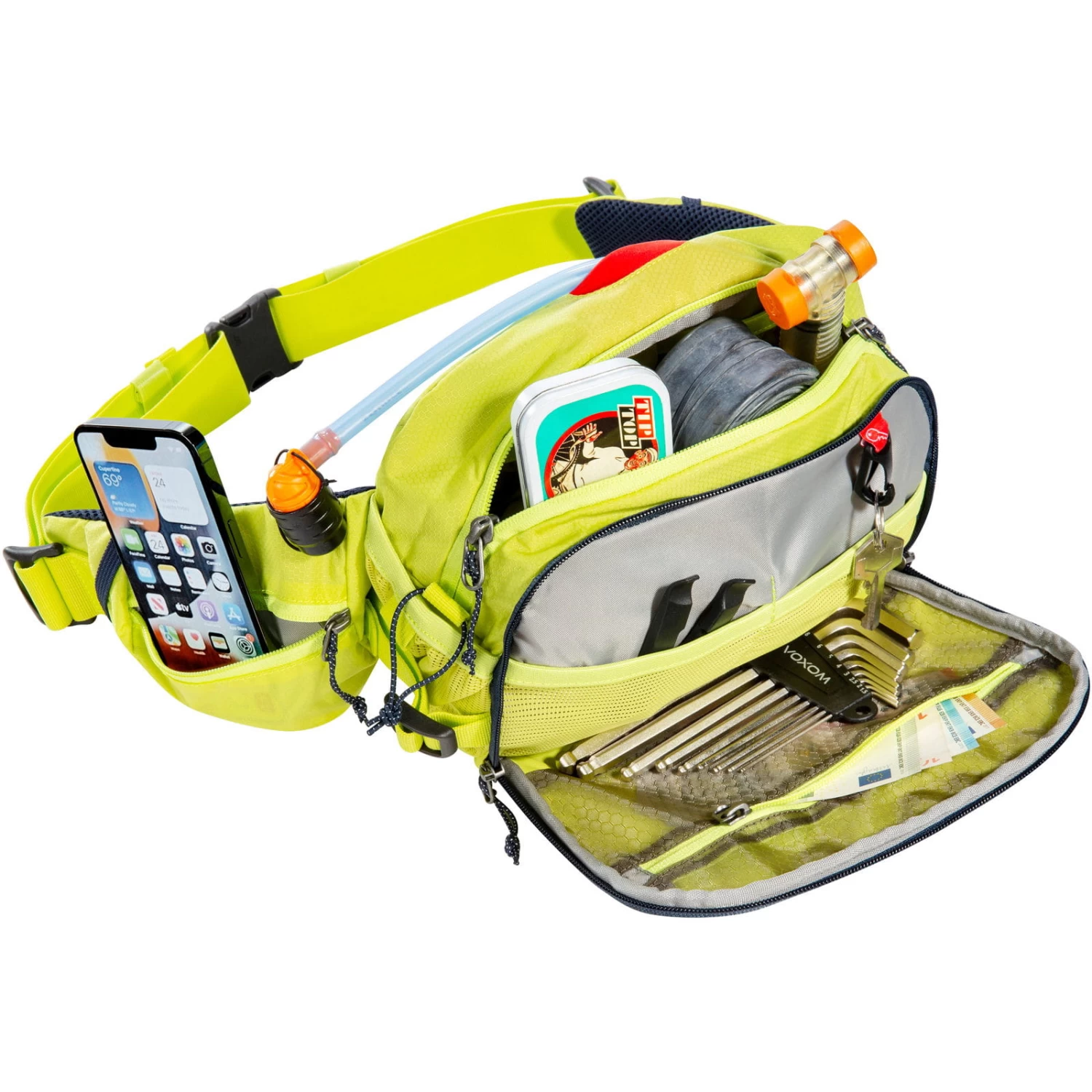 Die Hip Bag MTB 5 von Tatonka ist eine Fahrrad-Hüfttasche für Mountainbiker und ideal, wenn man das wichtigste Werkzeug, Smartphone, Getränke, Energieriegel und Windjacke auf der Radtour griffbereit haben möchte. Im großen Hauptfach befinden sich ein Einschubfach mit Halterung für eine 1-Liter-Trinkblase (Trinkblase nicht im Lieferumfang enthalten) und zwei weitere elastische Einschubfächer. Die Hüfttasche verfügt außerdem über eine Fronttasche mit Unterteilungen für Werkzeug, zwei seitliche Netztaschen, in denen Trinkflaschen bis 170 ml befestigt werden können und Reißverschlusstaschen an den Hüftflügeln. Somit bietet die sportliche Hüfttasche ausreichend Stauraum für persönliche Wertsachen, Smartphone oder sonstiges Equipment. Der verstellbare Hüftgurt und die Kompressionsriemen sorgen für einen festen Sitz am Körper positioniert und die gepolsterte AirMesh-Rückseite für angenehmen Tragekomfort.