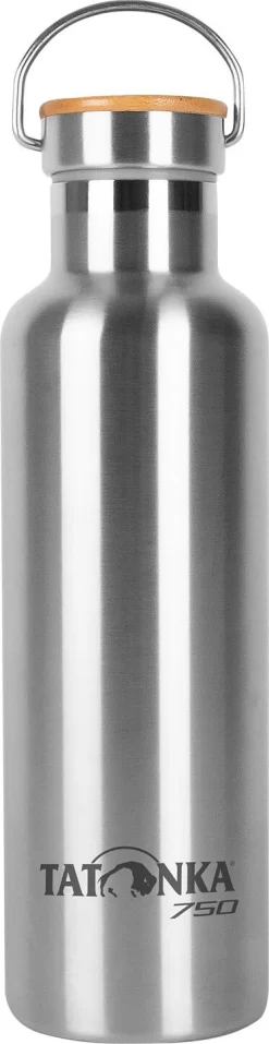 Bruchsichere Edelstahl-Isolierflasche mit Bambusdeckel und 750 ml Fassungsvermögen: Tatonka Hot+Cold Stuff Bamboo Lid 750 Die formschöne, unzerbrechliche Isolierflasche aus doppelwandigem Edelstahl ist die perfekte Wahl für unterwegs. Sie eignet sich sowohl für warme als auch für kalte Getränke. Der Edelstahl-Schraubverschluss besitzt eine BPA-freie Silikondichtung, der Deckel aus nachhaltigem Bambusholz verfügt über einen praktischen Edelstahl-Bügel. Mithilfe eines Materialkarabiners kann die Flasche so ganz einfach am Rucksack gesichert werden.